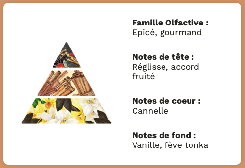 Un hommage vibrant à la cannelle épicée, ce parfum éveille les sens avec ses notes chaleureuses et sucrées. La réglisse et les accords fruités en tête offrent une introduction vive, avant de laisser place à une cannelle ardente, adoucie par une base de vanille et de fève tonka.