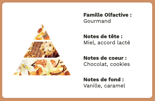 Un voyage gourmand dans une cuisine où les cookies au chocolat sortent tout juste du four. Les notes de tête de miel et d'accord lacté ouvrent la voie à un cœur chocolaté, soutenu par une base douce de vanille et de caramel, évoquant une douce gourmandise sucrée.
