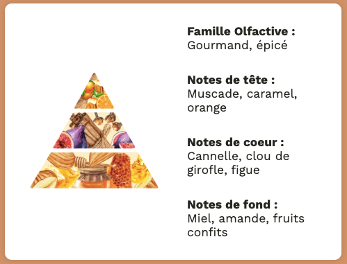 En fond, le miel, l’amande et les fruits confits diffusent un sillage sucré et réconfortant.