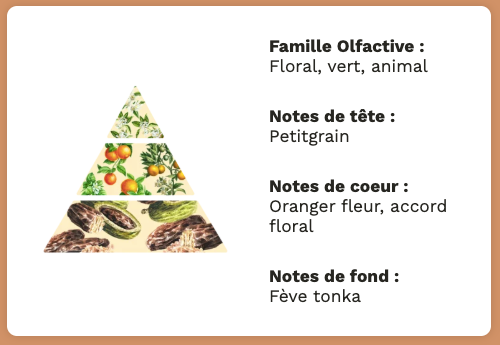 Un véritable hymne à la nature, ce parfum dévoile en première note un petitgrain pétillant, qui s'ouvre ensuite sur un cœur floral où l'oranger est mis en lumière, avant de s'arrêter sur une base douce et réconfortante de fève tonka.