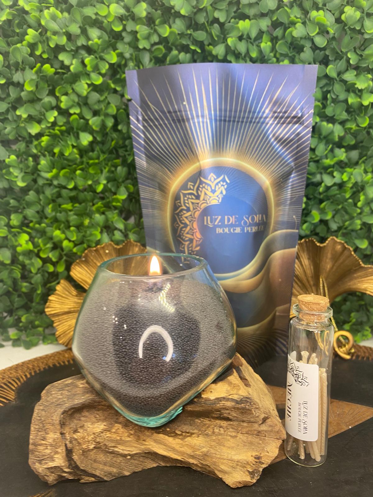 Libérez votre créativité avec le sachet bougie perlée 250g (Noir) ⚫️ + 10 mèches inclus LUZ DE SOLIA . Ce sachet contient des perles de cire naturelles et rechargeables, offrant jusqu'à 75 heures de combustion . Parfait pour tous types de récipients, il est également étanche et vous permet de changer de parfum à volonté. (Contenant non inclus !)